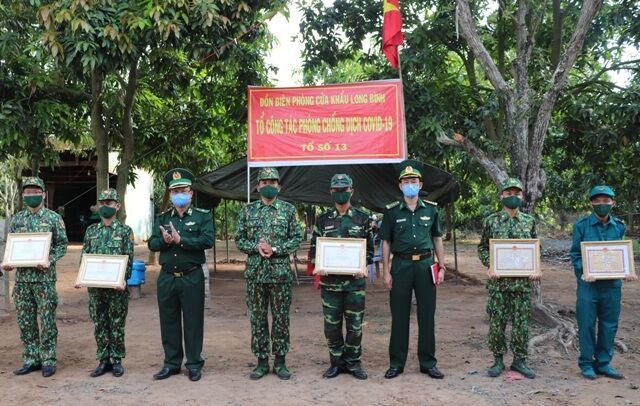 Đại úy Hoàng Minh Tuấn (thứ 4, từ phải qua) nhận Bằng khen của Bộ Tư lệnh BĐBP vì thành tích xuất sắc trong chỉ đạo, tổ chức thực hiện nhiệm vụ phòng, chống dịch COVID-19, giai đoạn 1. Ảnh: vov.vn