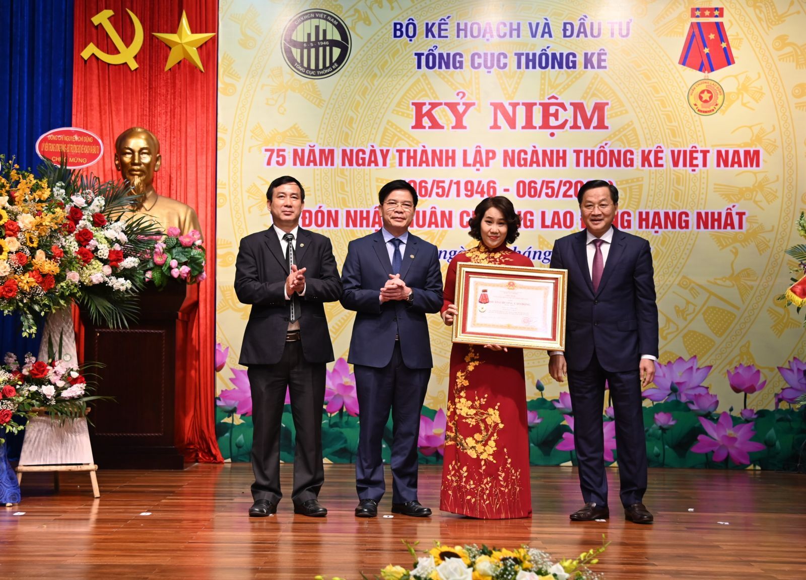Điểm lại các mốc son trong quá trình xây dựng và phát triển, bà Nguyễn Thị Hương - Tổng cục trưởng Tổng cục Thống kê khẳng định: Trong mỗi giai đoạn, mỗi thời kỳ, với tên gọi khác nhau, dù chức năng, nhiệm vụ có thay đổi nhưng nhiệm vụ quan trọng, xuyên suốt trong 75 năm qua của ngành thống kê đó là biên soạn và cung cấp thông tin kinh tế - xã hội, những bằng chứng xác thực giúp Đảng, Nhà nước xây dựng, giám sát và đánh giá thực hiện chiến lược, kế hoạch phát triển kinh tế xã hội của đất nước, của các bộ, ngành, địa phương. Tại buổi lễ, thay mặt Lãnh đạo Đảng, Nhà nước, đồng chí Lê Minh Khái trao Huân chương Lao động hạng Nhất cho Tổng cục Thống kê.