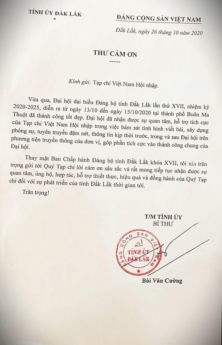 Tỉnh ủy Đắk Lắk vừa gửi thư cảm ơn đến sự quan tâm, đồng hành tích cực của các cơ quan thông tấn báo chí, trong đó có Tạp chí Việt Nam Hội Nhập trong công tác tuyên truyền tại Đại hội đại biểu Đảng bộ tỉnh Đắk Lắk lần thứ XVII nhiệm kỳ 2020 -2025.