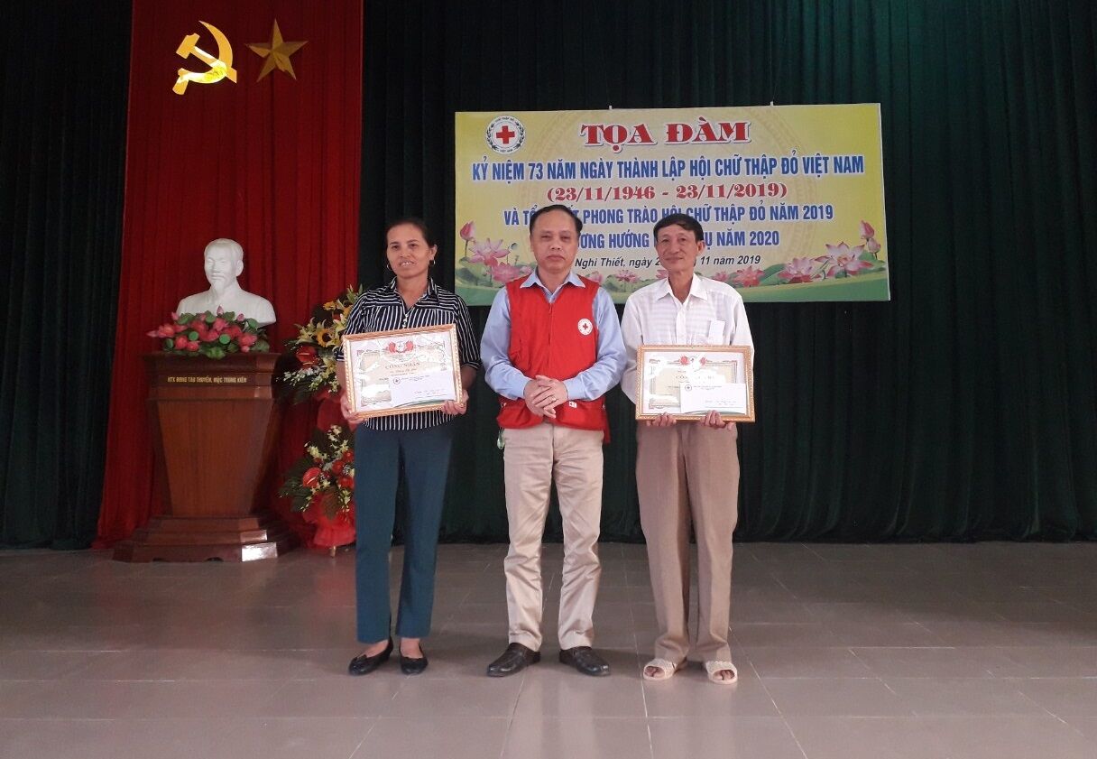 Đại diện lãnh đạo Hội CTĐ Việt Nam huyện Nghi Lộc trao tặng quà và giấy khen cho các tập thể, cá nhân có thành tích xuất sắc trong phong trào Hội CTĐ của địa phương