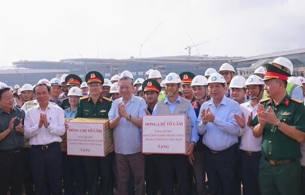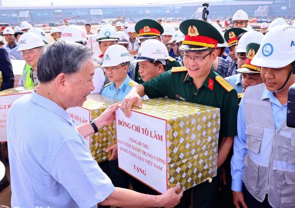 Tổng Bí thư Tô Lâm tặng quà động viên lực lượng thi công Dự án Cảng hàng không quốc tế Long Thành.