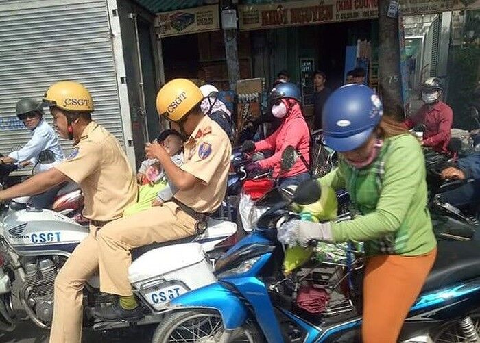Hình ảnh đẹp thượng úy Vũ Đình Nam và Trung úy Đoàn Tấn Phú thuộc Đội CSGT Tân Sơn Nhất (PC67) dùng xe đăc chủng đưa em bé đi cấp cứu vào tháng 6/2018