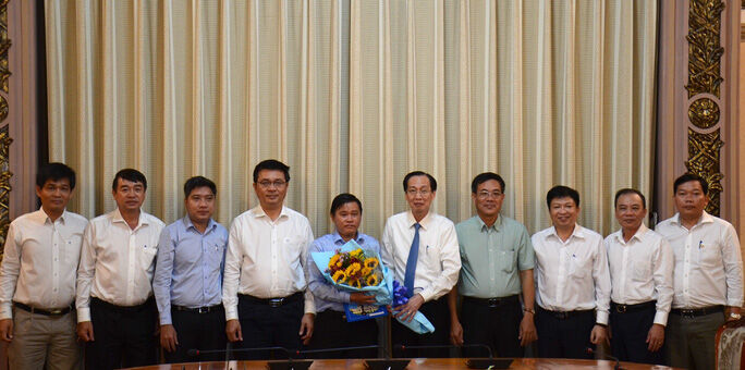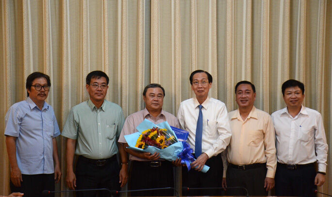 Đồng chí Trần Quang Bá (cầm hoa) được UBND TP điều động đến nhận công tác tại Thành ủy TP.HCM