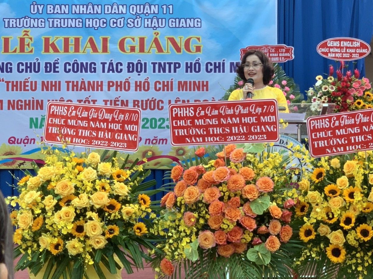 Tại trường THCS Hậu Giang, Quận 11, các giáo viên và học sinh đã chuẩn bị những tiết mục văn nghệ, sản phẩm thủ công để trang trí trong ngày khai giảng. "Năm 2021 là một khoảng thời gian đầy biến động, cả nước nói chung và ngành giáo dục nói riêng gặp vô vàn khó khăn, không thể tổ chức khai giảng cho năm học bởi đại dịch COVID-19. Tuy nhiên, bằng sự nỗ lực, vượt khó, quyết tâm dạy và học online, trực tuyến nhưng các em vẫn hoàn thành tốt công cuộc học tập, trường cũng đạt niềm vui lớn khi là đơn vị dẫn đầu phong trào thể dục thể thao Hội khỏe Phù Đổng khối Trung học cơ sở Nhất Thành phố. Tôi rất mong toàn thể lực lượng giáo viên Nhà trường ra sức cố gắng, phấn đấu hoàn thiện bản thân và đổi mới sáng tạo để hoàn thành thật tốt công cuộc đổi mới. Cũng mong toàn thể học sinh hoàn thành thật tốt các nhiệm vụ học tập, tu dưỡng để đạt đến các mục tiêu trở thành công dân tốt, trở thành nguồn nhân lực chất lượng cao cho xã hội" - Cô Nguyễn Thị Tuyết Nga – Hiệu trưởng trường THCS Hậu Giang nói.