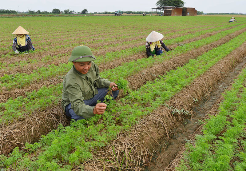 Trên diện tích 40ha, anh Linh trồng dưa hấu, ngô, đỗ, cà rốt đông, củ cải đường (trong đó cà rốt đông là nguồn thu nhập chính). Theo anh Linh, cà rốt thích hợp trồng trên đất phù sa, bãi bồi cao. Cùng với các yếu tố về giống thì khâu xử lý đất trước khi gieo trồng bảo đảm khô, tơi xốp và đặc biệt phải được xử lý mầm bệnh cũng rất quan trọng. Để có thể xuất khẩu sản phẩm, trong quá trình sản xuất, toàn bộ diện tích chỉ sử dụng phân hữu cơ và chế phẩm sinh học, năng suất đạt trung bình đạt 2,5-3 tấn/sào, chất lượng, mẫu mã củ tốt, được công ty và thương lái đến thu mua tận ruộng.