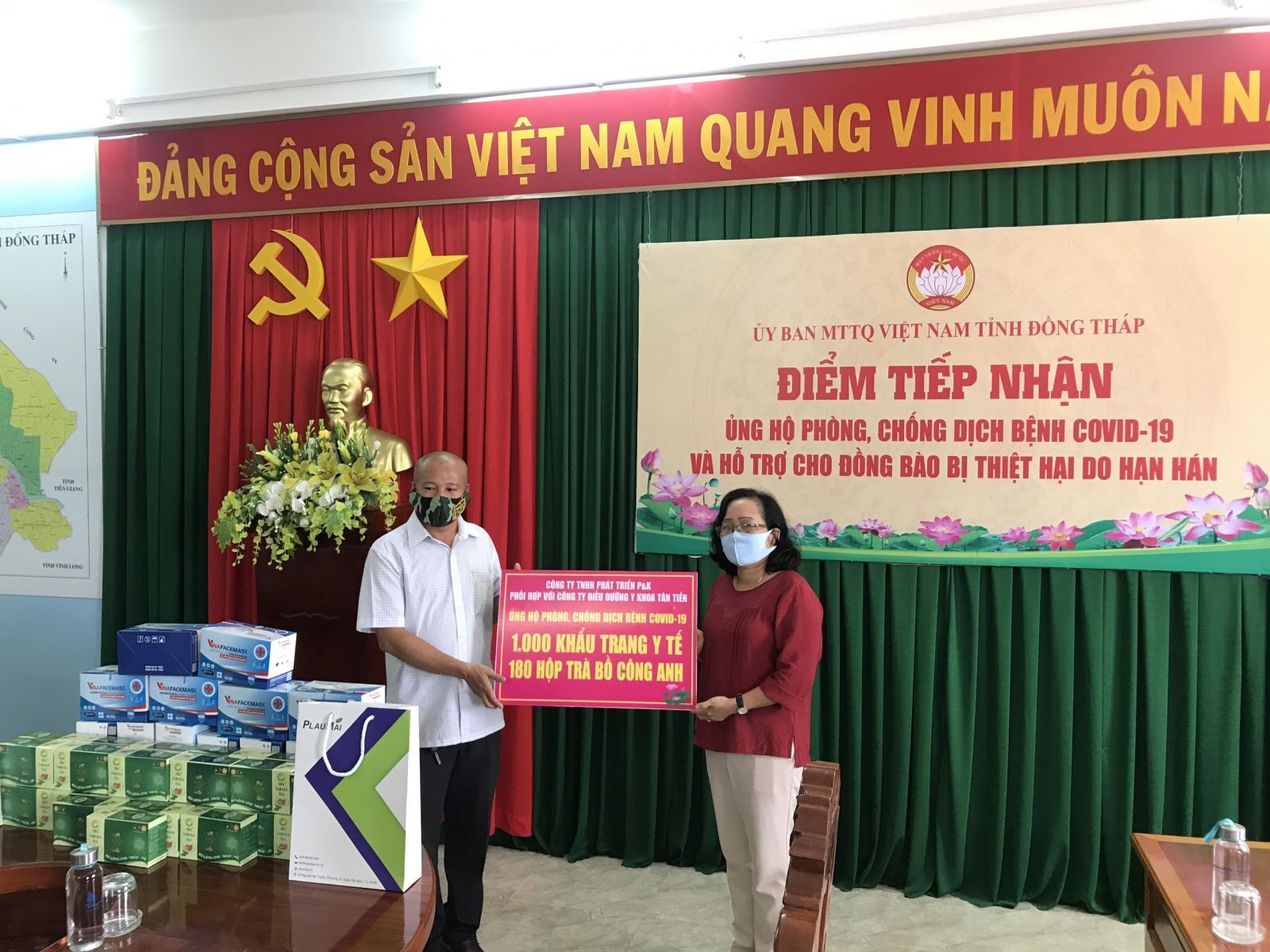Bà Đoàn Thị Nghiệp - Phó Chủ tịch Ủy ban MTTQVN tỉnh Đồng Tháp tiếp nhận quà từ ông Đỗ Thanh Phương - Công ty TNHH Phát triển P&K gồm 1.000 khẩu trang y tế và 180 hộp trà Bộ Công Anh, tổng trị giá hơn 20 triệu đồng.