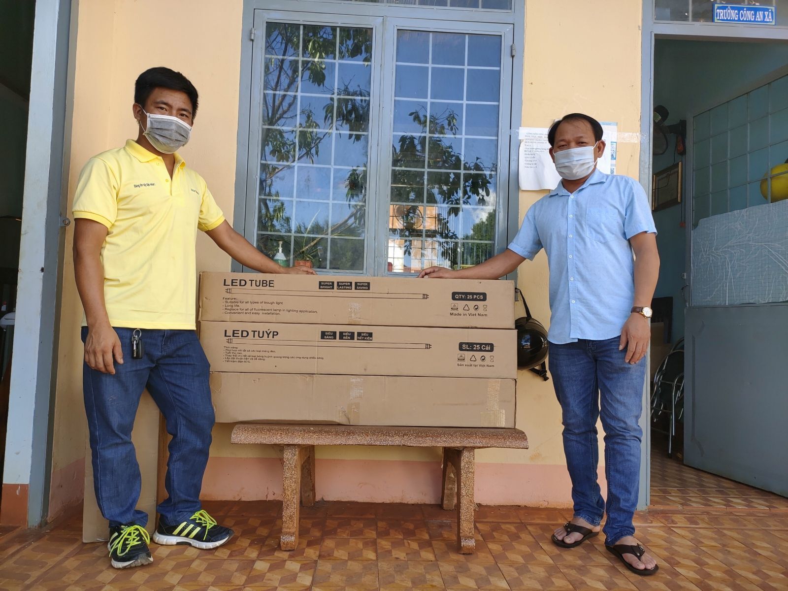 Ông Hồ Đình Kỳ, HUV, Bí thư Đảng ủy, chủ tịch HĐND xã Ia Dom và ông Ksor thiết, Phó Bí thư Đảng ủy xã Ia Dom đại diện nhận bóng đèn từ nhà tài trợ.