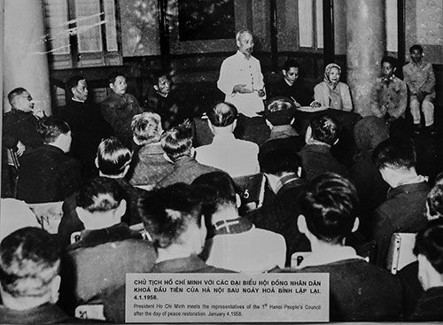 Chủ tịch Hồ Chí Minh với các đại biểu HĐND khóa đầu tiên của Hà Nội sau ngày hòa bình lập lại 4/1/1958 (Ảnh: baobinhthuan).