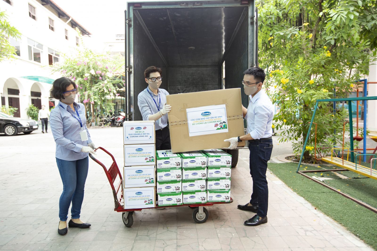 Sáng ngày 08/04/2020, chuyến xe của Vinamilk mang theo những thùng sữa, khẩu trang, nước rửa tay do chính tay các nhân viên của Công ty chuẩn bị đã khởi hành đến Trung tâm phục hồi chức năng và trợ giúp trẻ khuyết tật tại TP.HCM. Đây là 1 trong 24 trung tâm nuôi dạy trẻ em khó khăn, có hoàn cảnh đặc biệt trên cả nước sẽ nhận được sự hỗ trợ từ chương trình “Vinamilk - Triệu bước đi, đẩy lùi Cô-vi” về các nhu yếu phẩm giúp ngăn ngừa dịch bệnh như khẩu trang, nước rửa tay và sữa để tăng cường dinh dưỡng.