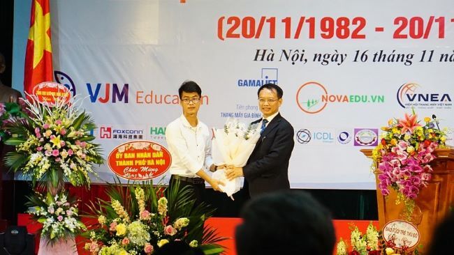 Tân sinh viên khoá 12 trường Cao đẳng nghề Công nghệ cao Hà Nội tặng hoa cho đại diện nhà trường nhân dịp 20/11