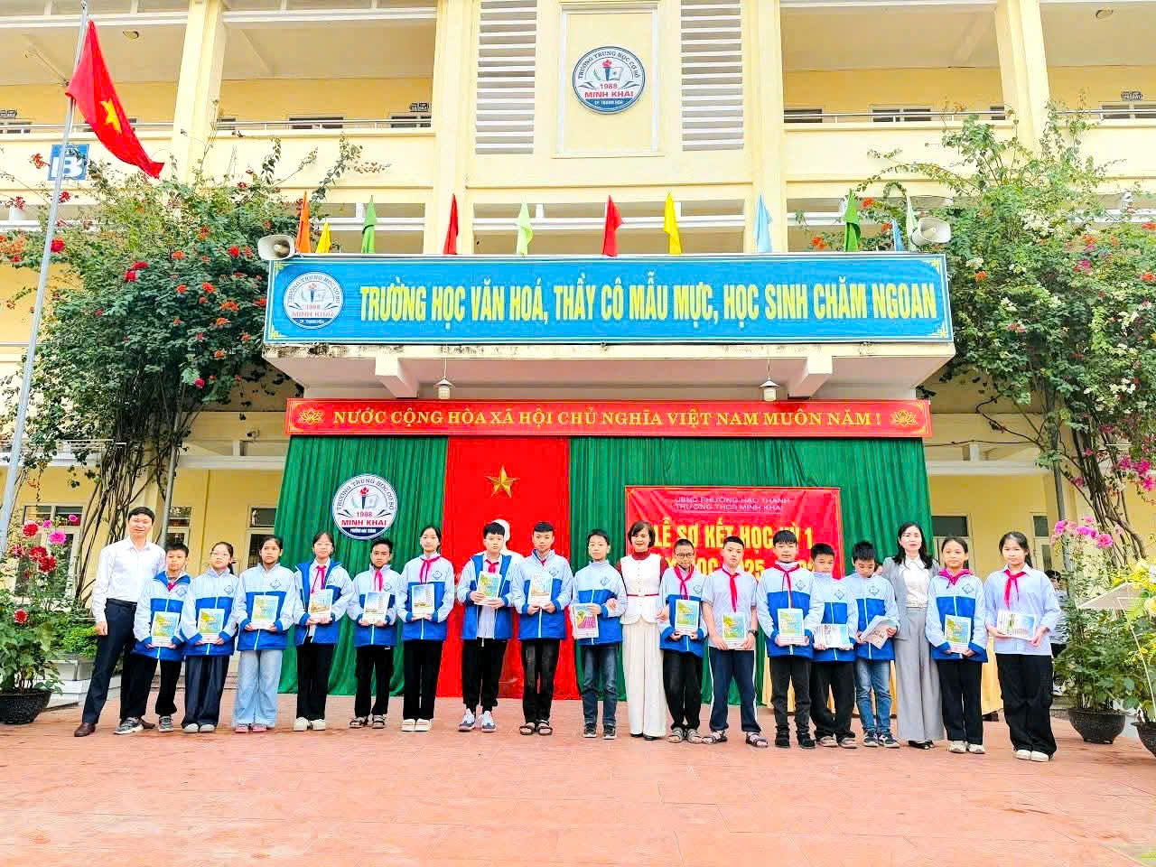 Bước vào năm học 2025-2026, học kỳ I nhà trường thêm một lần nữa ghi dấu ấn với chất lượng đại trà và chất lượng mũi nhọn tăng lên rõ rệt. Trong đó nổi bật là thành tích trong các cuộc thi. Về cấp Quốc tế có 01 Giải Đặc biệt của trường Đại học Kinh Abulaziz; 01 HCV trong Cuộc thi “Sáng tạo KHKT dành cho thanh thiếu niên nhi đồng”, đồng thời đạt giải Nhì cấp quốc gia. Về cấp tỉnh môn văn hóa có 04 HS đạt giải, trong đó có 01 giải Nhất Thủ khoa (em Nguyễn Trọng Duy, lớp 9A1 môn Tin học); 01 giải Nhì (em Nguyễn Khánh Huyền, lớp 9A1 môn Ngữ văn); 01 giải Ba (em Nguyễn Thị Hà Vy, lớp 9A5 môn GDCD) và 01 giải KK; Cuộc thi “Tìm hiểu lịch sử đảng bộ tỉnh và truyền thống cách mạng của Nhân dân Thanh Hóa” đạt 01 giải Ba (em Lê Ngọc Bảo Anh (7A4); Cuộc thi “Sáng tạo Robotic” đạt 07 giải. Cuộc thi “Đại sứ văn hóa đọc” có 02 giải (01 giải Ba, 01 giải KK). Cấp phường: Cuộc thi “Dưới cờ Đảng quang vinh - Tiến bước lên Đoàn” có 06 học sinh đạt giải; Cuộc thi “An toàn giao thông cho Nụ cười ngày mai” có 05 giải (Giáo viên 01 Giải Nhì-cô giáo Lê Thị Yên; Học sinh đạt 04 giải). Đáng chú ý, có 92 em đạt điểm thi học kì I ba môn từ 27 điểm trở lên, đây là những bông hoa tiêu biểu trong vườn hoa thành tích của nhà trường, là minh chứng sinh động cho tinh thần chăm chỉ học tập, ý thức tự giác và quyết tâm vươn lên của các em. Qua đó, khơi dậy động lực học tập, nuôi dưỡng ước mơ và khát vọng chinh phục tri thức cho các em trên chặng đường tiếp theo, góp phần xây dựng trường THCS Minh Khai ngày càng phát triển vững mạnh trong giai đoạn mới.
