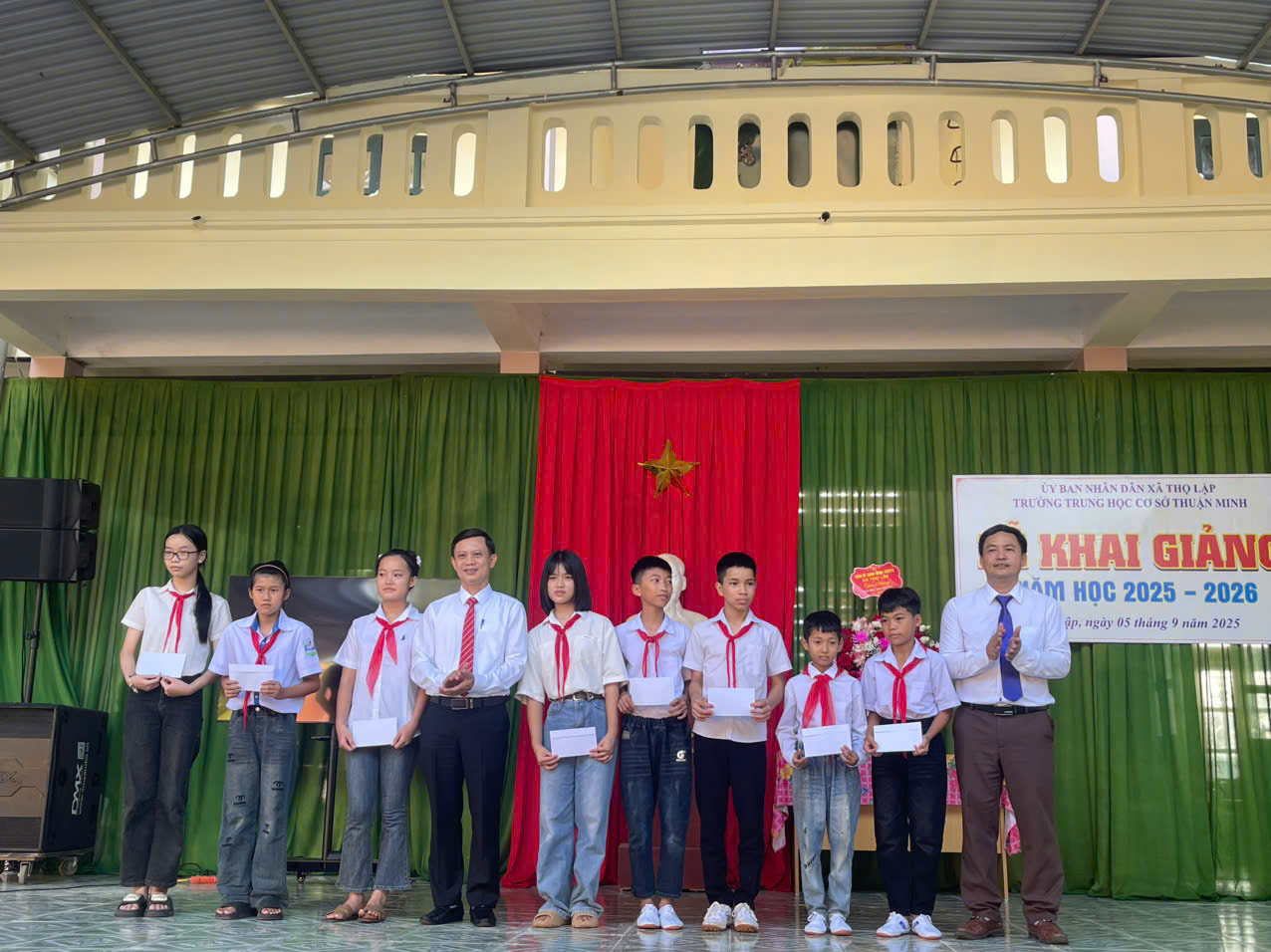 Thầy Trịnh Đình Tứ, Hiệu trưởng nhà trường cùng ban lãnh đạo xã Thọ Lập trao khen thưởng các thầy cô và học sinh đạt thành tích xuất sắc trong năm học 2024-2025