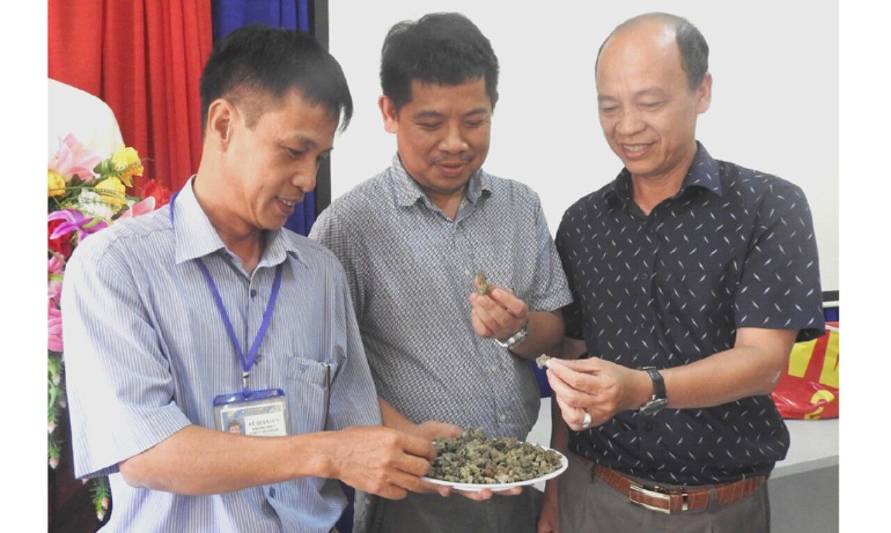 TS Đặng Văn Lái (phải) cùng giảng viên, sinh viên đang thử nghiệm sản phẩm mới “máy tách tim sen”
