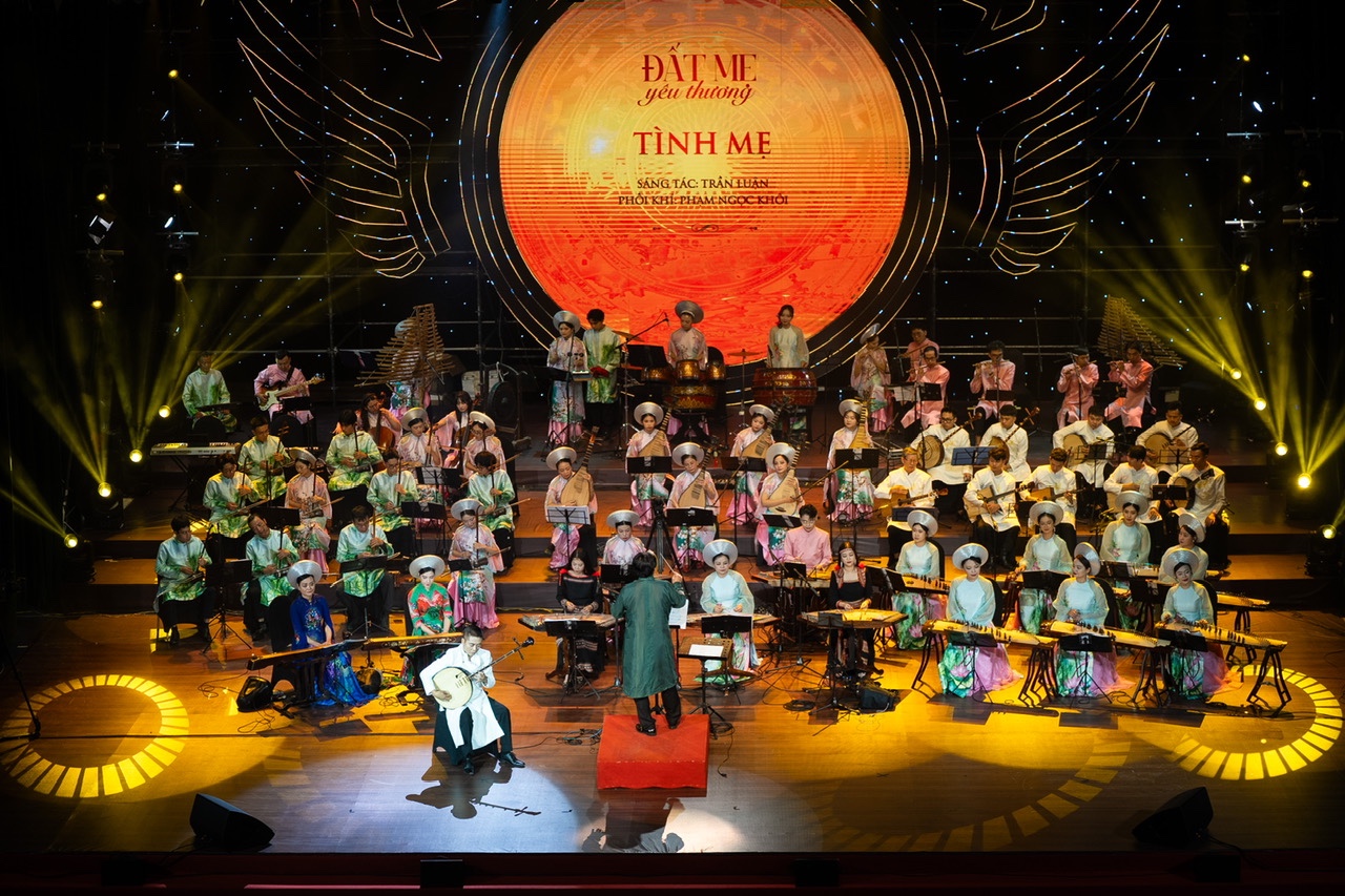 TS.NSND. Cồ Huy Hùng và dàn nhạc dân tộc trình diễn tiết mục “Tình mẹ” trong chương trình chính luận nghệ thuật Đất mẹ yêu thương do Đài Truyền hình Hà Nội tổ chức.