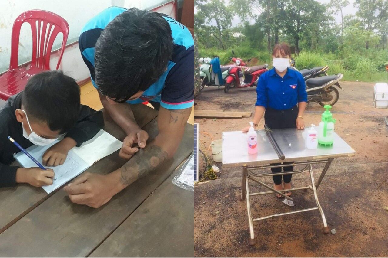 Hình ảnh thanh niên tận tình giúp các em nhỏ ở thôn làng học chữ.