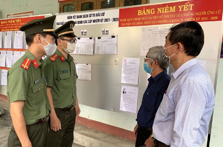 Lực lượng an ninh Công an TP Tuy Hòa trao đổi, nắm tình hình về ANTT tại tổ bầu cử ở phường 8 (Ảnh: Hoa Siêm).
