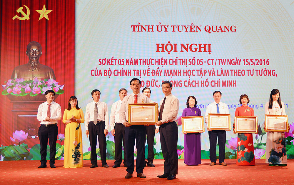 Đồng chí Phan Xuân Thủy, Phó trưởng Ban Tuyên giáo Trung ương và đồng chí Lê Thị Kim Dung, Phó Bí thư Thường trực Tỉnh ủy trao Bằng khen của UBND tỉnh cho các tập thể có thành tích xuất sắc trong thực hiện Chỉ thị 05.