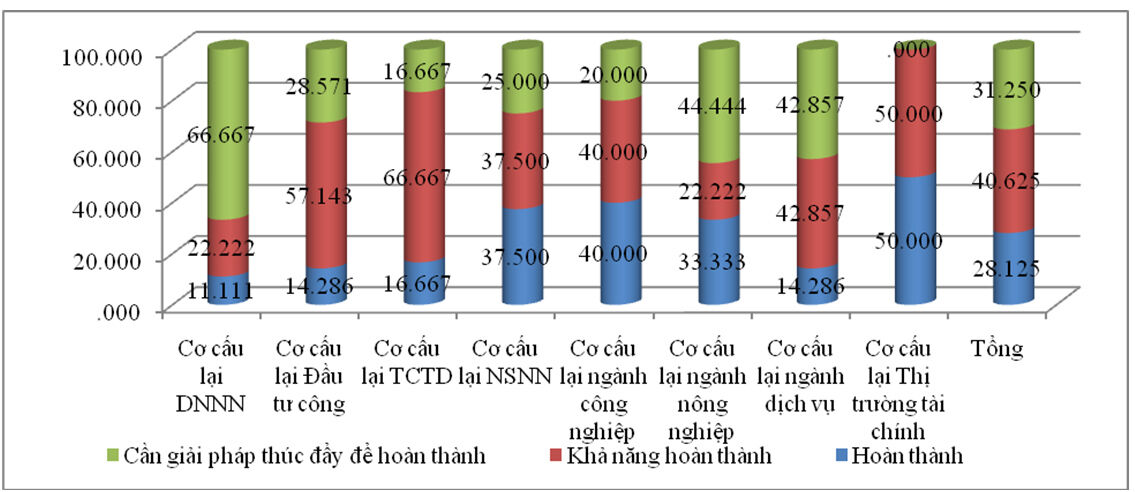 Theo biểu đồ này thì một số mục tiêu như: cơ cấu lại DNNN, cơ cấu lại đầu tư công, cơ cấu lại ngành nông nghiệp, cơ cấu lại ngành dịch vụ là những lĩnh vực còn có khá nhiều nội dung cần các giải pháp để thúc đẩy hoàn thành.