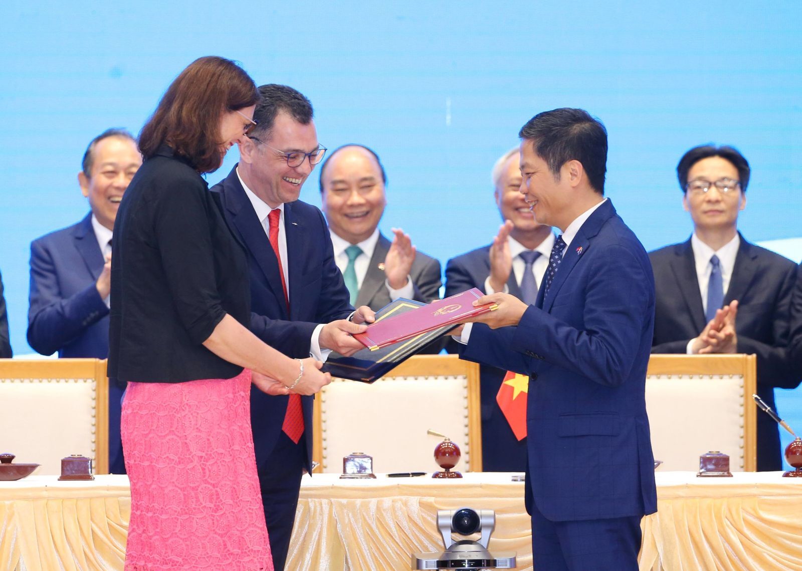 Ủy viên Bộ Chính trị, Thủ tướng Chính phủ Nguyễn Xuân Phúc chứng kiến trao đổi biên bản ký Hiệp định Thương mại tự do và Hiệp định Bảo hộ đầu tư giữa Việt Nam và Liên minh châu Âu, ngày 30-6-2019 _Ảnh: TTXVN
