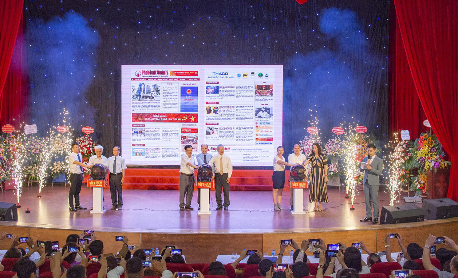 Các đại biểu ấn nút Ra mắt Chuyên trang điện tử Pháp luật Quản lý