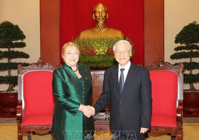 Tổng Bí thư Nguyễn Phú Trọng tiếp Tổng thống Chile Michelle Bachelet thăm cấp Nhà nước tới Việt Nam (năm 2017). (Ảnh tư liệu: TTXVN)
