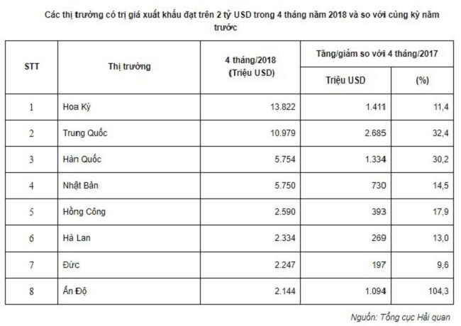 Về thị trường xuất khẩu, trong 4 tháng đầu năm 2018, có 18 thị trường xuất khẩu đạt kim ngạch trên 1 tỷ USD, trong đó có 8 thị trường đạt trên 2 tỷ USD.