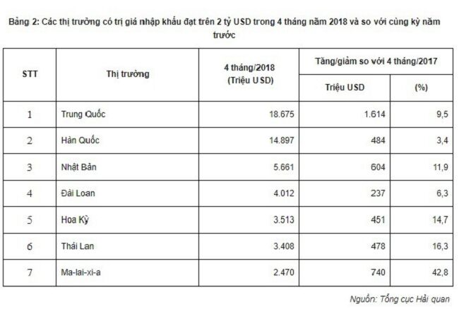Về thị trường nhập khẩu, trong 4 tháng đầu năm, có 11 thị trường Việt Nam đạt kim ngạch nhập khẩu trên 1 tỷ USD, trong đó có 7 thị trường đạt trên 2 tỷ USD.