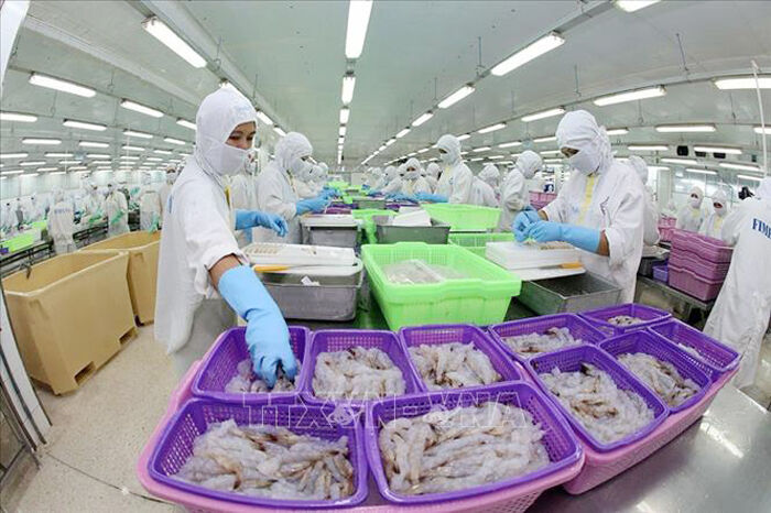 Chế biến sản phẩm tôm xuất khẩu tại nhà máy của Công ty Cổ phần Thực phẩm Sao Ta (Sóc Trăng). (Ảnh: TTXVN)