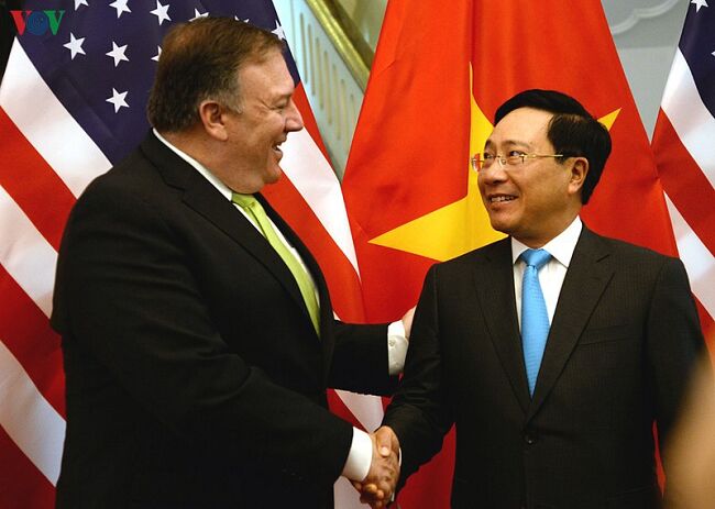 Phó Thủ tướng, Bộ trưởng Bộ Ngoại giao Phạm Bình Minh và Ngoại trưởng Hoa Kỳ Mike Pompeo trong chuyến thăm Việt Nam của ông Pompeo vào tháng 7/2018.