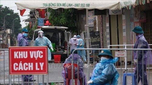 Lực lượng chức năng lập hàng rào cách ly thôn Hạ Lôi (Mê Linh, Hà Nội). (Ảnh: TTXVN)