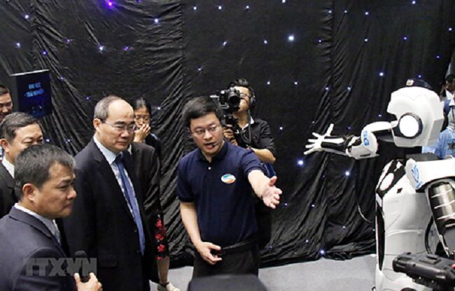 Bí thư Thành ủy Thành phố Hồ Chí Minh Nguyễn Thiện Nhân nghe giới thiệu về robot mô phỏng các động tác được điều khiển từ xa qua sóng 5G (Ảnh: TTXVN)