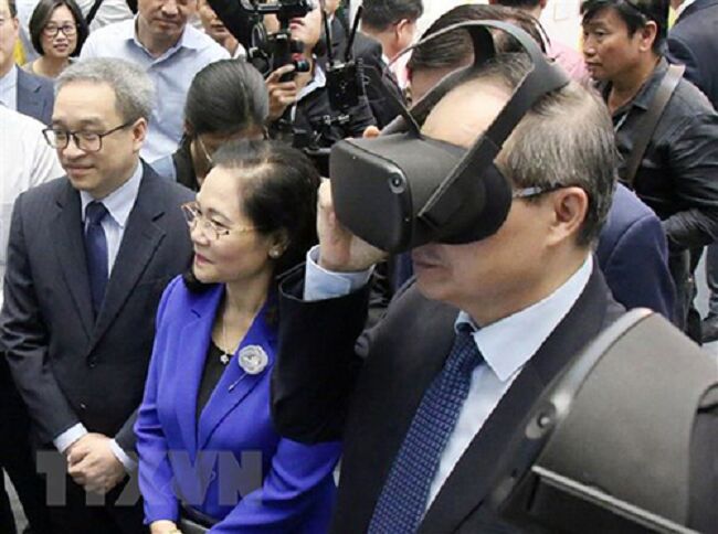 Các đại biểu tham quan và trải nghiệm công nghệ thực tế ảo trên đám mây của Viettel (Ảnh: TTXVN)