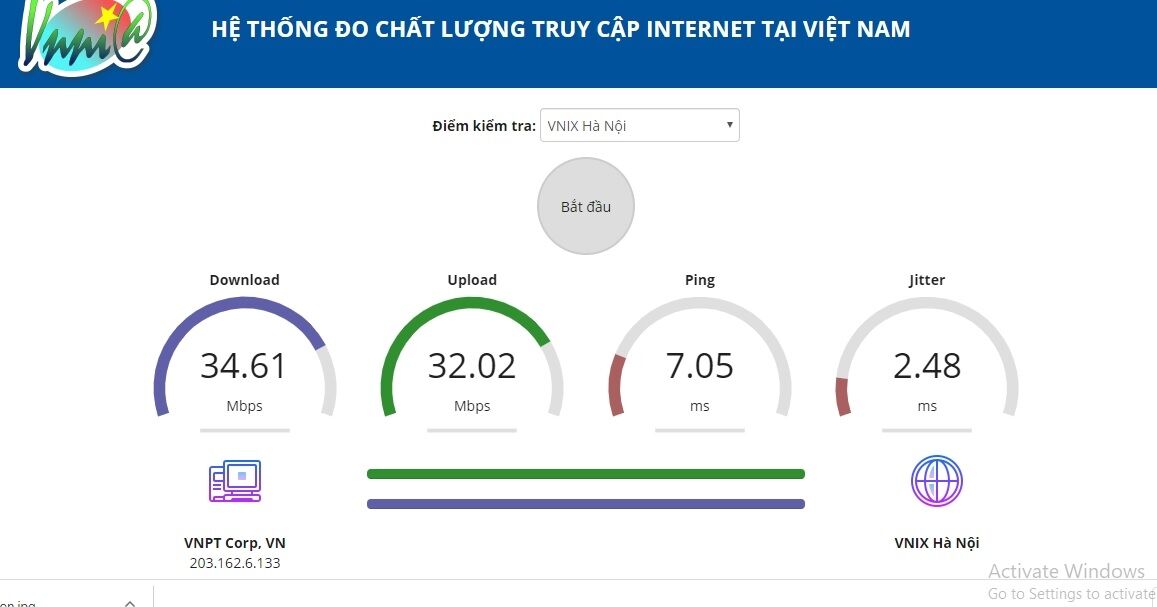 Người sử dụng có thể truy cập vào địa chỉ https://speedtest.vnix.vn, chọn điểm kiểm tra và thực hiện đo chất lượng kết nối Internet của mình một cách đơn giản, nhanh chóng. Các thông số về chất lượng truy cập Internet bao gồm tốc độ tải xuống (Download), tốc độ tải lên (Upload), tham số thể hiện thời gian trễ truy cập (Ping) và tham số thể hiện chất lượng, mức độ ổn định của kết nối internet (Jitter). Người dùng có thể đối chiếu kết quả với các thông số mà nhà cung cấp dịch vụ cam kết, đảm bảo được quyền lợi khách hàng của mình.
