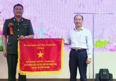 Đồng chí Lê Tiến Lam, Phó Chủ tịch Thường trực HĐND tỉnh trao Cờ thi đua của Chủ tịch UBND tỉnh cho Viettel Thanh Hóa vì đã có thành tích xuất sắc dẫn đầu trong phong trào thi đua yêu nước năm 2022.