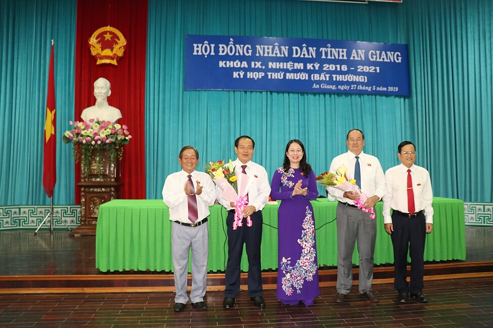 Đồng chí Võ Thị Ánh Xuân - Ủy viên BCH Trung ương Đảng, Bí thư Tỉnh ủy An Giang tặng hoa chúc mừng tân Chủ tịch UBND tỉnh An Giang Nguyễn Thanh Bình (thứ 2, bên phải).