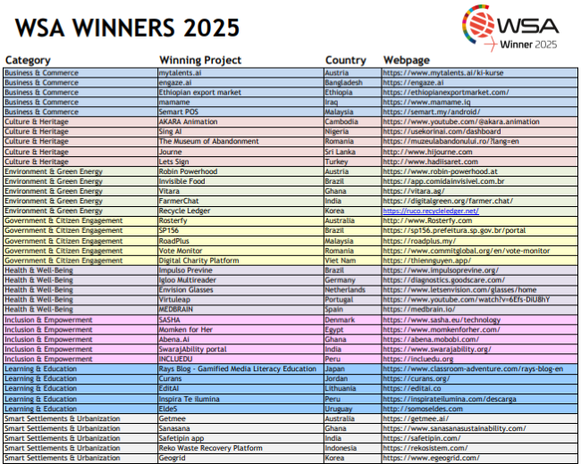 World Summit Awards là giải thưởng quốc tế được khởi xướng từ năm 2003, nhằm tôn vinh các giải pháp số tạo tác động xã hội, hướng tới đóng góp cho các Mục tiêu Phát triển Bền vững của Liên Hợp Quốc (UN SDGs). Trong mùa giải năm 2025, World Summit Awards ghi nhận hơn 400 giải pháp số được đề cử từ nhiều quốc gia, khu vực trên toàn cầu và lựa chọn 40 giải pháp xuất sắc nhất trên 08 hạng mục để vinh danh.
