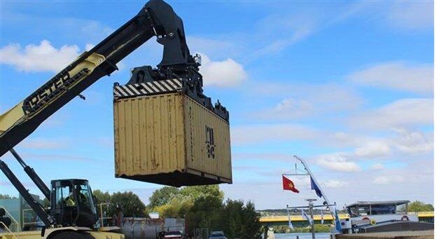Bốc xếp container hàng đầu tiên của tuyến vận tải thủy mới.