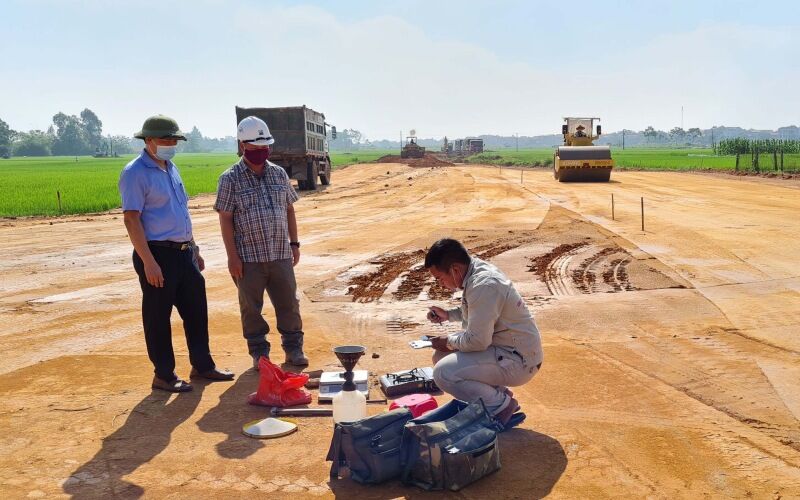 Kiểm tra độ chặt nền đường trên trục Đông Tây đô thị Vĩnh Phúc.