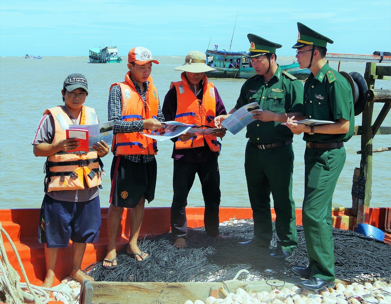 Cán bộ, chiến sĩ Bộ đội Biên phòng phát tờ rơi tuyên truyền pháp luật