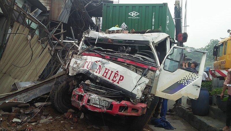 Tại hiện trường, phần phía trước các ngôi nhà cửa đổ sập, tường gạch ngổn ngang đổ vỡ. Phần đầu xe container biến dạng bẹp dúm. Bên trong xe, tài xế mắc kẹt, bất tỉnh, được người dân xung quanh giải cứu ra ngoài.