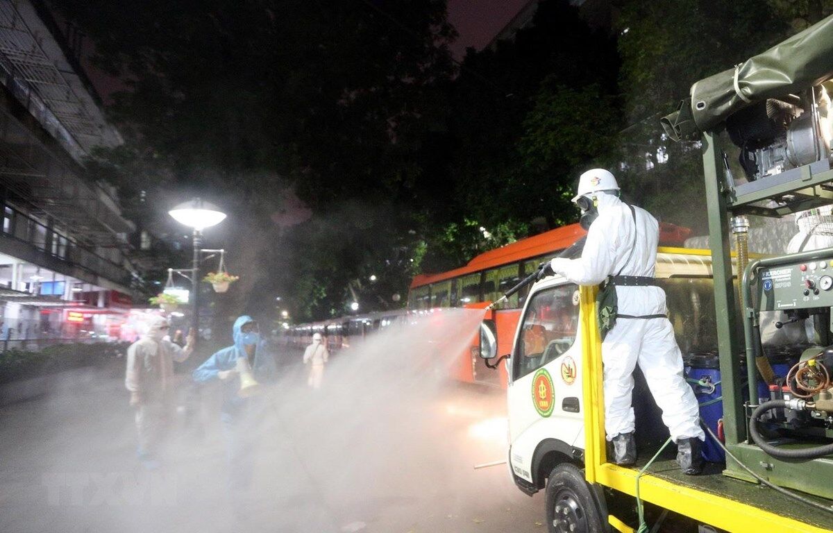 Lực lượng bộ đội hóa học phun hóa chất khử trùng, tẩy độc Bệnh viện Bạch Mai. Ảnh: Internet